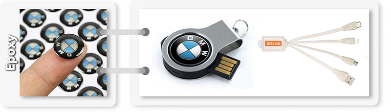 Processes: Print the logo on the sticker → Drop the resin glue on → Make it be dry enough → Inspect the logo detail, logo color, logo size and logo location.